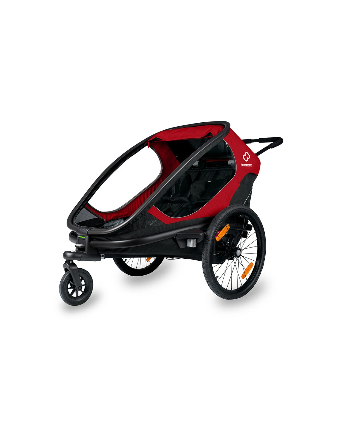 Double-locking system gör att du snabbt kan göra om vagnen från barnvagn till cykelvagn och vice versa. Det greppvänliga foam-handtaget kan justeras fritt i höjd för att ge föräldern en ergonomisk användning.