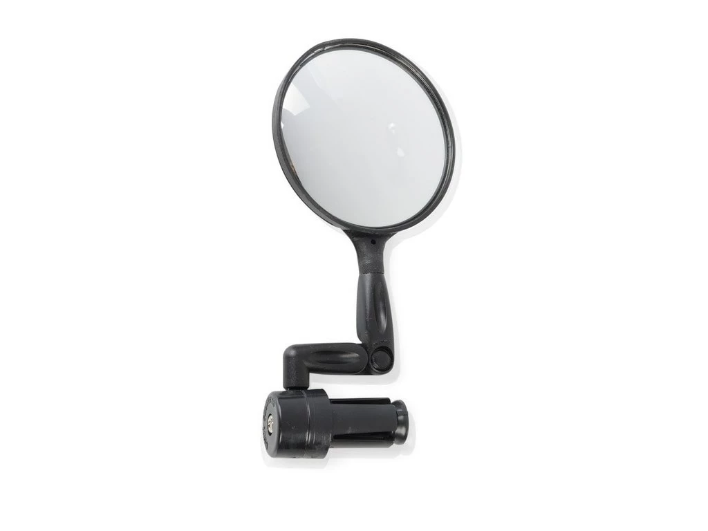 Denna sidospegel från XLC är monterad direkt i styrets ände och kan justeras i olika vinklar och höjder. Spegeln har en vinklad stång och är också justerbar i 3D.